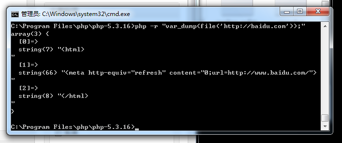 C:Program Filesphpphp-5.3.16>php -r "var_dump(file('http://baidu.com'));"