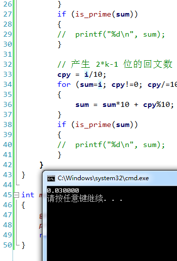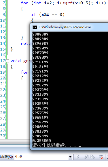 思路是没错,但是略慢了,可以看到主要时间耗在打表上,上网翻看了一下,http://wenku.baidu.com/view/8ee7ce7301f69e31433294e7.html,别人的思路不是打表,而是先判断回文,再判断质数,而是质数判断就直接穷举去除,看到他的最好的方法方法四是 0.5 秒,于是照着这个思路,重新搞,简单分析可以知道,任何一个 k 位正整数都可以产生一个 2*k 位和一个 2*k-1 位两个回文整数,例如,12 可以产生 121 和 1221 这两个,然后我们又知道,1 亿以内最大的数就是 99999999 了,8 个 9,那产生的时候最大也就 4 位数就可以了,照着这个思路,得到如下代码
