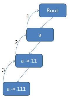 - 对于第三个字母,走到第三个 a 节点,并发现第三个 a 节点的 end 标志是 true,于是把这个节点的 value 值 111 加入结果集,并继续沿着失败指针,找到第二个 a 节点,发现他是 end 的,于是将 11 加入结果集,再沿着失败指针,找到第一个 a 节点和 root 节点,跳出。